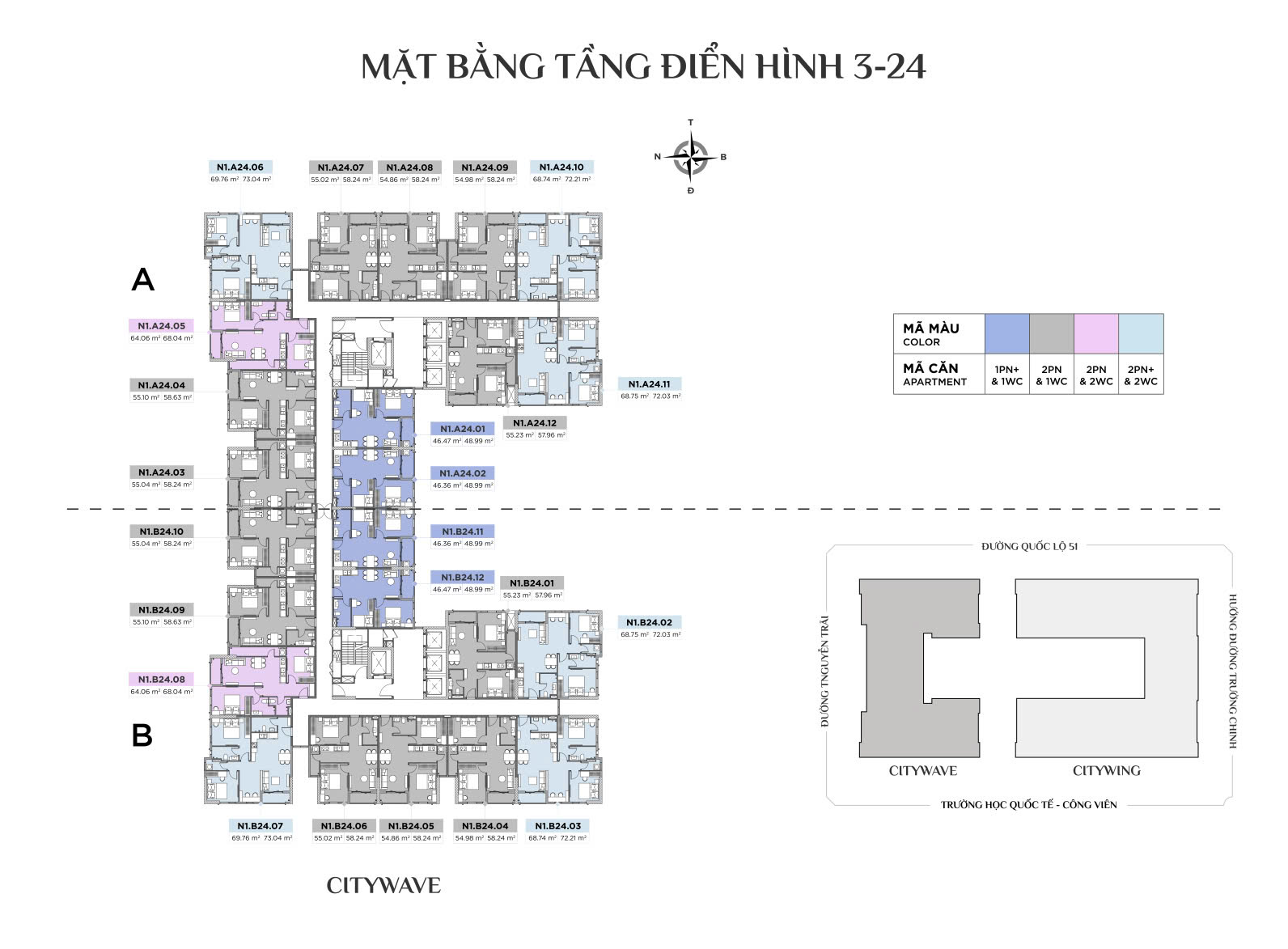 - Căn 2PN 2WC+: 68,73 m², thêm không gian linh hoạt.
