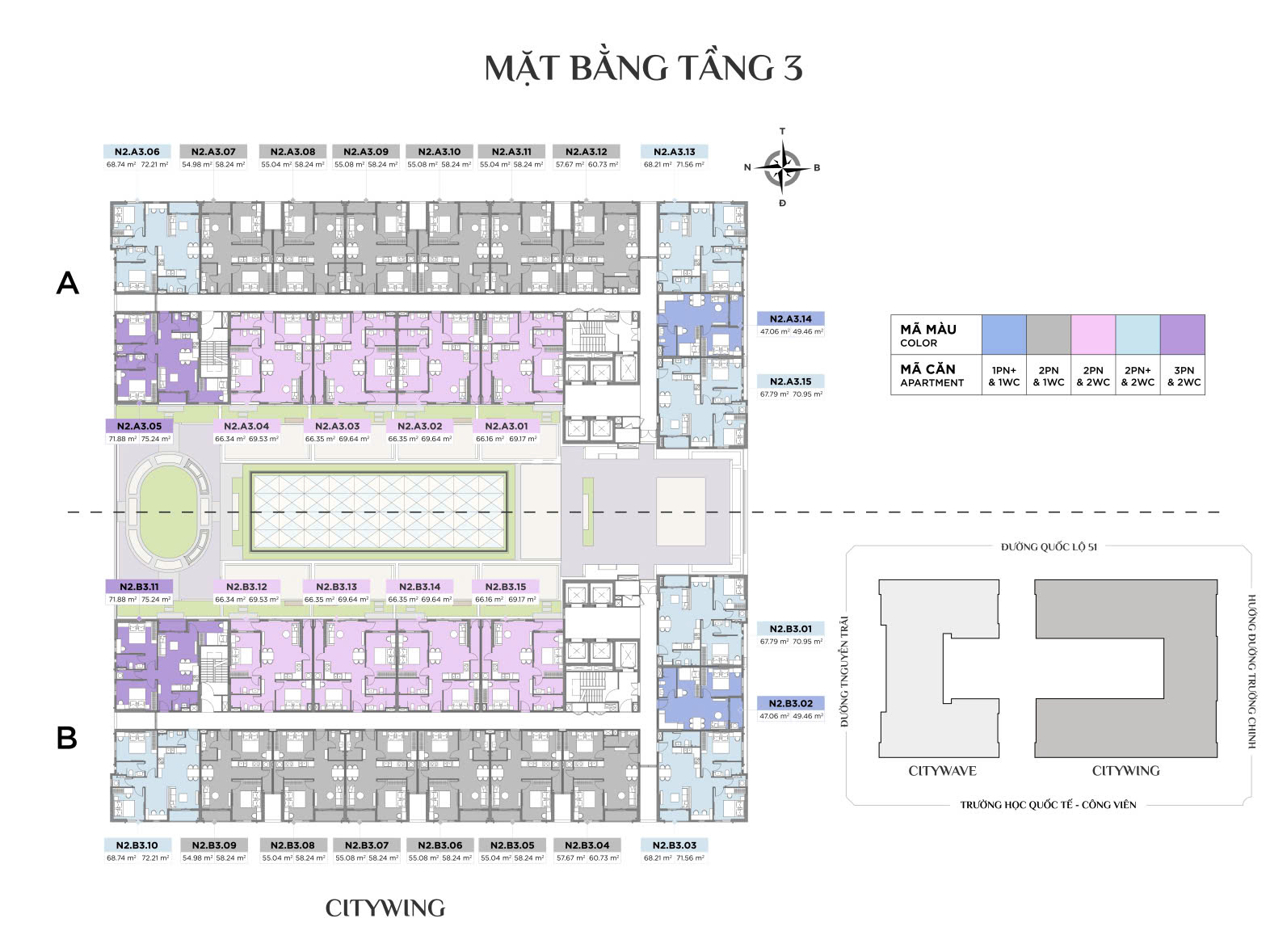 - Căn 3PN 2WC: 71,87 m², dành cho hộ gia đình đa thế hệ.